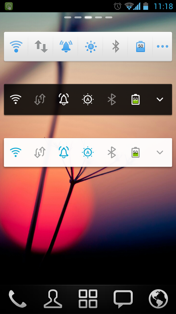 GO Switch Widget provides you a fast way to turn on/off many useful functions. GO Switch Widget provides you a fast way to turn on/off the functions in common use, such as Wifi, GPS, brightness, screen lock,flashlight, battery etc. In 4x1 style, up to 12 toggles and 2 controls are supported. Compare to other switch widgets, you can just simply drag the toggles to change their positions in the widget. Moreover, like other GOWidgets, theme is also supported. To make it work, you must install the latest version of GO Launcher EX which is the most popular home launcher app in Android Market. How to uninstall? To lock screen, the widget must be set as the device administrator. Once it's done, you cannot uninstall the widget directly like other normal GOWidgets. If you happen to uninstall it, you can follow the instruction below: Enter the "Settings" menu -> "Location and security" -> "Select device administrators" -> Make sure "GO Switch Widget" is not selected -> Then uninstall the Available Size: -4x1 -1x1 Since GO Switch Widget has the right to lock screen, to UNINSTALL it, you must execute the steps below first. Press the "menu" button in home screen of GO Launcher EX -> Select "Settings" -> Select "Location and Security" -> Select "Select device administrators" -> Make sure "GO Switch Widget" is not selected. Then try uninstall the widget like other usual applications. Some toggles may be out of work after your GO Switch Widget is upgraded. Please refer to the instruction below to figure them out. For the WiFi toggle (the instruction may be varied a little in different phones) Settings -> Wireless and network -> Wi-Fi settings -> Unselect “WiFi” -> Then try the WiFi toggle in the widget to open the WiFi network. For the Bluetooth toggle (the instruction may be varied a little in different phones) Settings -> Wireless and network -> Bluetooth settings -> Unselect “Bluetooth” -> Then try the Bluetooth toggle in the widget to open the Bluetooth function. For the screen lock toggle (the instruction may be varied a little in different phones) Settings -> Location and security -> Select device administrators -> Unselect “GO Switch Widget” -> Then try the “screen lock” toggle in the widget to lock the screen. Actions: - Wifi, Ringer, Brightness, Bluetooth, MobileNetwork, GPS, Auto-sync, Airplane mode, Auto-rotate, Vibrate, ScreenTimeout, Lock screen, Ringer volume, Media volume - Toggle position modification How to add GOWidgets to your home screen? - Long press on your home screen in GO Launcher EX. Press the GOWidget option and choose the widget you like. Make sure you have enough room for the widget.