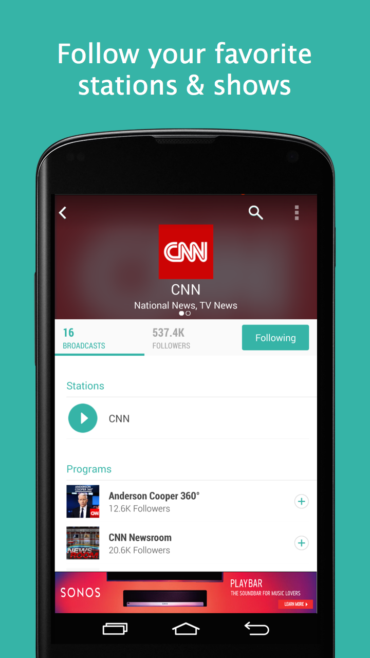 TuneIn هو راديو حقيقي، اكتشف، تابع واستمع الى الأشياء الأكثر اهمية بالنسبة لك في العالم. مجموعة كبيرة من الرياضة، الأخبار، الموسيقى ومحطات الراديو. تحتوي TuneIn على اكثر من 100,000 راديو حقيقي واكثر من 4 مليون مدونة صوتية من كافة انحاء العالم على هاتفك الأندرويد او جهازك اللوحي مجاناً. تابعنا على فيسبوك : www.facebook.com/tunein. تابعنا على تويتر www.twitter.com/tunein.