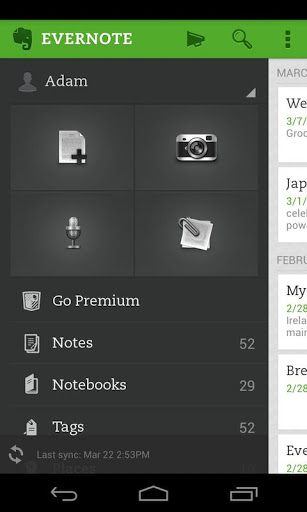 حائز على جائزة "أفضل 10 تطبيقات يجب الحصول عليها" من نيويورك تايمز وحائز ايضاً على جوائز TechCrunch Crunchies, Mashable,Webbys Evernote تطبيق سهل الإستخدام ومجاني يساعدك على تذكر كل شيء على كل الأجهزة التي تستخدمها. ابق منظماً، احفظ افكارك وحسن انتاجيتك.Evernote تجعلك قادراً على اخذ الملاحظات، التقاط الصور، إنشاء قوائم المهام، والتذكير بتسجيل صوت - ويجعل هذه الملاحظات سهلة البحث ، سواء كنت في المنزل أو في العمل، أو أثناء التنقل. المميزات: - يعمل مع Evernote للأعمال: إلتقط، تصفح،ابحث وتبادل ملاحظات الأعمال والدفاتر التجارية من الهاتف الذكي أو الكمبيوتر اللوحي. -يوحد كل من الملاحظات الخاصة بك عبر أجهزة الكمبيوتر والأجهزة التي تستخدمها -يقوم بإنشاء وتحرير الملاحظات النصية، قوائم المهام التي عليك القيام بها - يقوم بحفظ الملفات، ومشاركتها -يسمح بالبحث عن النصوص داخل الصور - تنظيم الملاحظات حسب أجهزة الكمبيوتر المحمولة والعلامات -يسمح بارسال الملاحظات عبرالبريد الإلكتروني وحفظ التغريدات على حساب Evernote الخاص بك - يمكن وصل Evernote إلى التطبيقات والمنتجات التي تستخدمها -يمكن مشاركة الملاحظات مع الأصدقاء والزملاء من خلال الفيسبوك وتويتر مميزات النسخة المطورة: إضافة رمز سري إلى تطبيق Evernote الخاص بك وفيما يلي بعض الطرق لاستخدام Evernote في حياتك الشخصية والمهنية: -بحث ذكي: التقاط الصور من ألواح الكتابة والكتب -تنظيم الملاحظات وجداول الأعمال والمذكرات البحثية -تتبع خطط السفر وتذاكر الطائرة وجوازات السفر -تنظيم وحفظ الوصفات، البحث عن طريق المكونات في وقت لاحق -إنشاء قائمة مشتريات أو مهام وقم بوضع علامة على الأشياء التي أنجزتها - عرض صفحات الويب المحفوظة في Evernote على سطح المكتب الخاص بك -دوّن الافكار والإلهام عند التنقل - الوصول إلى الملفات والملاحظات التي أنشأتها على هاتفك من حاسوبك -تتبع المنتجات والأسعار لمقارنتها اثناء التسوق -تحفظ الإيصالات والفواتير والعقود -الحد من فوضى الأوراق عبر اخذ لقطات من قوائم المطاعم، وبطاقات العمل والملصقات -استخدام Evernote كجزء من نظامك للقيام بالأمور (GTD) لمساعدتك على البقاء منظماً للحصول على أقصى استفادة من Evernote الخاص بك، حمل البرنامج على جميع أجهزة الكمبيوتر والهواتف التي تستخدمها. Evernote متاح على كل الجهزة المحمولة والهواتف والاجهزة اللوحية لمعلومات اكثر عن الأذونات: http://evernote.com/privacy/data_usage.php تعرف على المزيد: http://evernote.com/getting_started/
