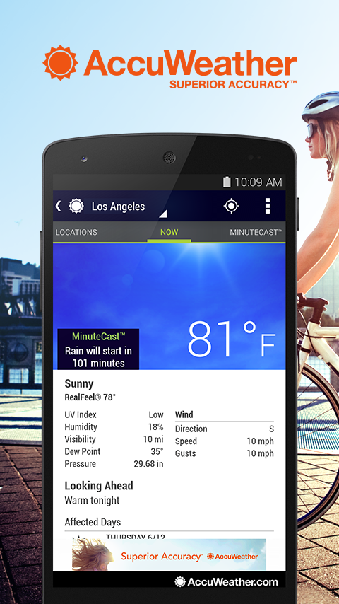 The all new AccuWeather is here! We listened to your feedback and created an app that’s even more information and feature rich, and offers the same superior accuracy and great experience across all Android smartphones and tablets, including Nexus 10! Weatherproof your day for free with these features: • Push notifications for severe weather alerts in the United States – now also included on tablets! • For worldwide locations, when AccuWeather forecasts snow, ice, rain, wind, or the probability of thunderstorms, you’ll see an orange exclamation point displayed within the location’s current and 15-day screens. • Customizable My AccuWeather lifestyle forecasts for specific health concerns and outdoor activities. Categories include: Outdoor Fitness, Travel, Respiratory Health, Fishing and Game, and Do-It-Yourself. • Home screen widget displaying two-day forecasts with severe weather warnings for your GPS location, and a time clock. Resizable, multi-location widgets are also now available with even more weather detail! • Radar for all of North America and Europe, and worldwide satellite overlaying interactive Google Maps™. A snapshot view of the maps for your saved locations is now available! • Current news and weather videos, with many available in both English and Spanish. • Social media sharing so you can share your location’s current conditions, hourly, or 15-day forecasts using the social media apps you already have on your device. You also get the accurate, local weather forecasts and the customization you expect from AccuWeather: • Accurate and local forecasts for 2.7 million locations worldwide. Forecasts update every 15 minutes with information for the next 15 days – all in 27 different languages. • Current weather conditions update every 15 minutes with the very latest humidity and precipitation percentages, dew point, visibility, UV index, wind speed gusts and direction, times for sunrise and sunset, and RealFeel® – AccuWeather’s exclusive weather forecasting system that analyzes multiple weather factors to determine how the local temperature actually feels. • Local weather forecast summaries that provide an overview of the next five days’ weather forecast along with a description of the most dramatic weather event expected during the five days. • Status bar on the home screen displaying the current temperature for your current or home location. • Ability to store an unlimited amount of locations. • Choice between metric or imperial units, 12-hour or 24-hour time display, and portrait or landscape view. Please note: Sunrise and sunset times are found in Daily Details which can be viewed by tapping on daily forecast. Also, AccuWeather Holo Dark and Light widgets display RealFeel® and can occupy only 4x1 space as before. We have added "Dew Point" and "Probability of precipitation" as per popular requests. Download AccuWeather for free and start experiencing the most accurate and local weather forecasts available!