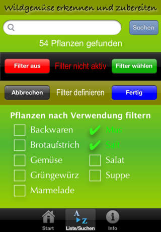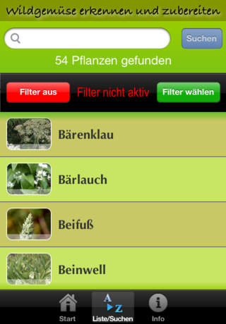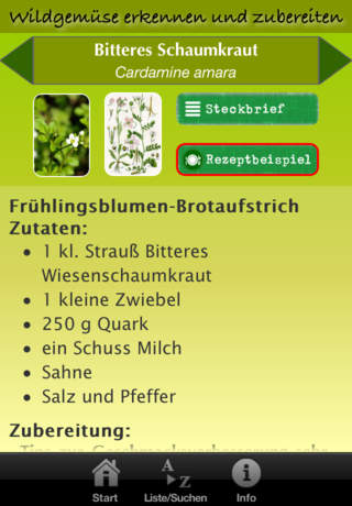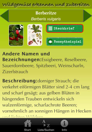 Jetzt herunterladen! Preisreduzierung bis Ende November! Als Wildgemüse werden essbare Wildpflanzen bezeichnet. Wildgemüse besitzen oft ein intensives Aroma und sind meistens reich an wertvollen Inhaltsstoffen. Viele Arten wurden früher bereits kultiviert und sind dann wieder in Vergessenheit geraten. Diese App zeigt 55 dieser einheimischen Wildpflanzen mit Bildern, Beschreibungen und wichtigen Informationen zum Sammeln und Verwenden der Pflanzen, die Sie fast überall in Europa finden können. Für jede Pflanze ist ein praktisches Kochrezept vorhanden, das Sie mit wenig Aufwand und allgemein erhältlichen Zutaten zubereiten können. Sehr praktisch ist die Möglichkeit, die Liste nach der Verwendung der Pflanze zu filtern, dabei kann nach diese Kriterien gefiltert werden: • Backwaren • Brotaufstrich • Gemüse • Grüngewürz • Marmelade • Mus • Saft • Salat • Suppe Die App zeichnet sich durch die einfache, intuitive Handhabung und durchdachte Bedienungselemente und eine durchgängig ansprechende Benutzeroberfläche aus. Hier die Vollständige Liste der enthaltenen Pflanzenbeschreibungen: Bärenklau • Bärlauch • Beifuß • Beinwell • Berberitze • Birke • Bitteres Schaumkraut • Breitwegerich • Brombeere • Brunnenkresse • Dost • Erdbeere • Gänseblümchen • Gänsefingerkraut • Giersch • Große Brennnessel • Gundermann • Günsel • Hagebutte (Heckenrose) • Hederich • Himbeere • Hirtentäschel • Holunder • Hopfen • Huflattich • Kerbel • Klette • Knoblauchsrauke • Linde • Löffelkraut • Löwenzahn • Lungenkraut • Malve • Nachtkerze • Pastinak • Preiselbeere • Quendel • Sanddorn • Sauerampfer • Schafgarbe • Scharbockskraut • Schlehdorn • Schwarze Maulbeere • Spitzwegerich • Sumpfdotterblume • Vogelmiere • Wegwarte • Weiße Melde • Weiße Taubnessel • Wiesenbocksbart • Wiesenklee (Rotklee) • Wiesenknöterich • Wiesensalbei • Wiesenschaumkraut • Wilde Möhre