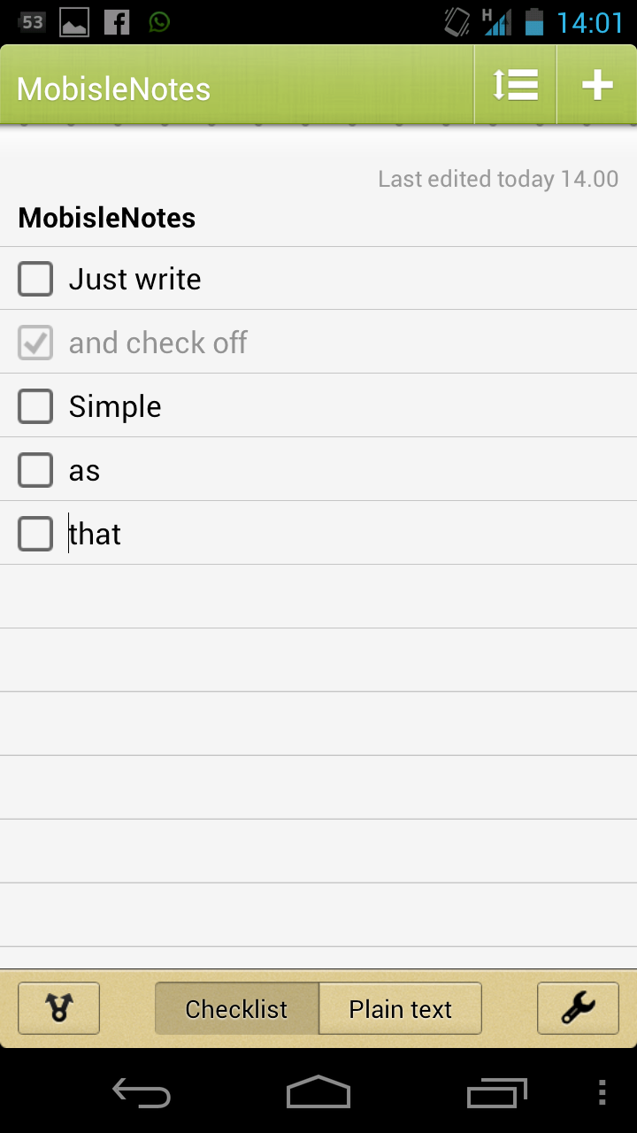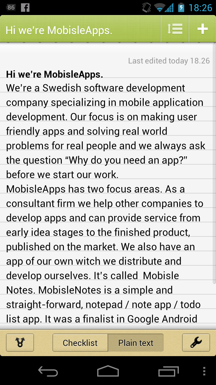 NOTE: The Springpad import feature is now live! Use the web interface at https://mobislenotes.com and press Import in the top bar. ☆ The dead-simple way to do notes and to-do’s ☆ Have you tried Springpad, Evernote, Remember the Milk, Wunderlist and other notes or to-do apps for your phone but think there’s just too much going on getting in the way of the actual note-taking? Tags, due-dates, categories, projects, font-styling, notes on the notes, and what-not. Note-taking shouldn’t be work, it should be a simple unloading of your brain to save for later. With MobisleNotes, we’re going back to basics. It’s the actual digital equivalent of your trusty old notepad. Just write down whatever is on your mind. Done with it? Just check it off. Simple as that. Notes and checklists. Well, ok. There’s a liiitle bit more: ☞ CHECKLIST/PLAIN TEXT SWITCHING Writing down ideas, or making a to-do list? Doesn’t matter. Just write, and switch whenever you feel like it. ☞ FOLDERS, REMINDERS AND PASSWORDS What you need to stay organized and keep your notes safe. ☞ GLOBAL SEARCH Where did I put that cake recipe? Never fear, global search is here! ☞ NOTE COLLABORATION Co-work on notes with your friends or better half. Make plans together, share a shopping list or write a novel together. ☞ BACKED UP AND SYNCED ACROSS ALL YOUR DEVICES iPhone, iPad, Macs or PCs, edit your notes wherever you want and your notes stay synced and backed up. ☞ SHARE NOTES PRIVATELY OR PUBLICLY Share notes with anyone using a simple URL, keeping them updated as you edit them. Keywords : Notebook, NotePad, Notes, Shopping List, ToDo List, 2do, Colornote, Evernote, Task, Memo, Sticky Note, Post It, notes, notepad, evernote, gtd, wunderlist, 记事本, 메모장, catch, springpad, Mobisle notes, блокнот, any.do, anydo, A product by Mobisleapps AB (http://mobisleapps.com)