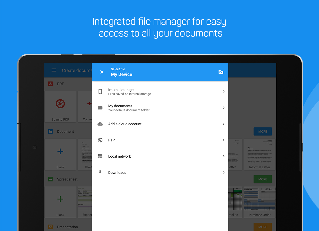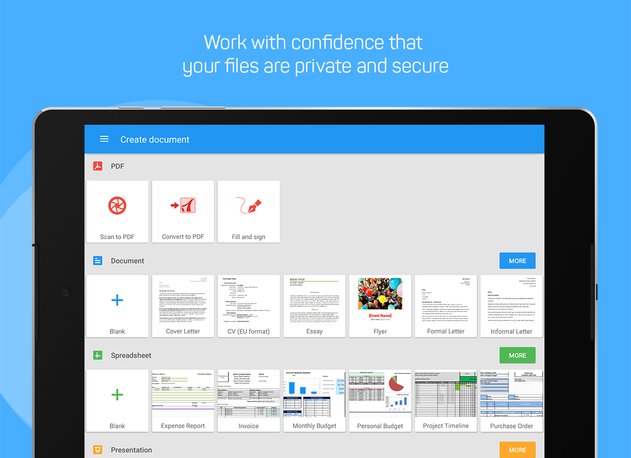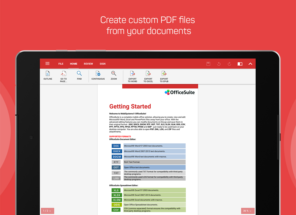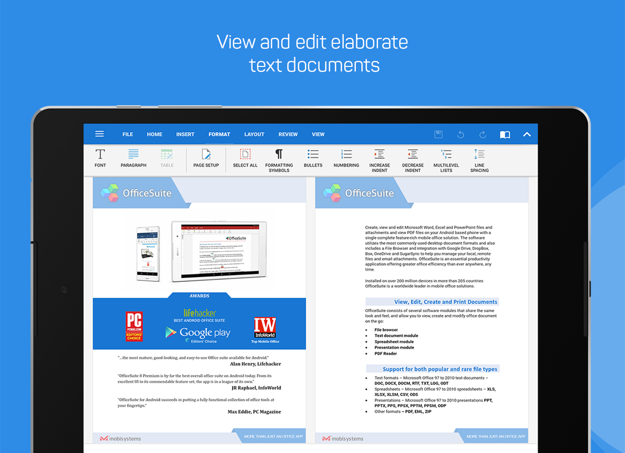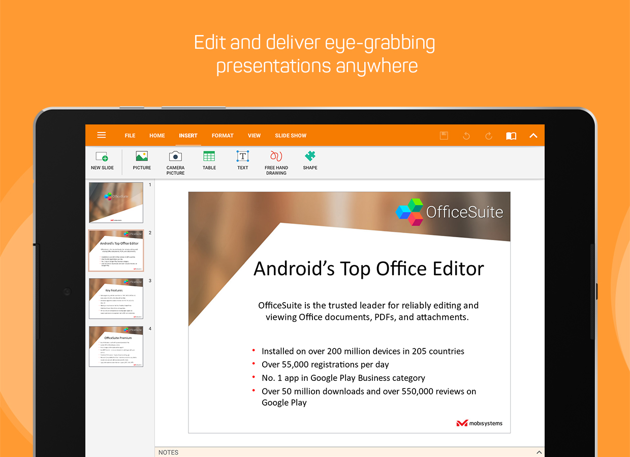 The latest OfficeSuite is our fastest ever, with drastically improved speed across the entire app and a refreshed design that makes it easier to use than ever! * The most downloaded office app on Google Play * Delivers the most exclusive features over any other office app * Installed on 200 million devices in 205 countries and growing * Over 50 million downloads alongside 55,000 daily activations OfficeSuite lets you easily view, edit, and create Word, Excel, and PowerPoint documents, convert to/from PDF, and manage your files all with the most feature-rich mobile office solution available on Android. Preloaded by top manufacturers including Sony, Amazon, Acer, Alcatel, Toshiba, Sharp, YotaPhone, Kyocera and more. GOOGLE PLAY EDITORS’ CHOICE INFOWORLD'S TOP MOBILE OFFICE LIFEHACHER BEST ANDROID OFFICE APP PCMAG EDITORS’ CHOICE AWARD THE LATEST OFFICESUITE IS SPECIALLY DESIGNED AROUND ANDROID M: * Create a profile and save your app settings and personalizations across devices * Open multiple documents simultaneously * Create custom headers, footers, and page number options for Word documents * Add freehand drawings over PowerPoint slides * Protect individual sheets and cells in Excel for extra security * Cast presentations across multiple devices on the same network with Share Cast * Use Quick Sign to easily sign a PDF using your digital signature KEY FEATURES: * View, create and edit complex office documents all from a familiar desktop-style interface. * Full compatibility with Microsoft formats including DOC, DOCX, DOCM, XLS, XLSX, XLSM, PPT, PPTX, PPS, PPSX, PPTM, PPSM. * Support for PDF files including PDF camera scanning and Export to PDF. * Additional support for common formats like RTF, TXT, LOG, CSV, EML, ZIP; (Open Office - ODT, ODS and ODP - support available as in-app purchase). * Integrated with File Commander for quick and easy access to both local and remote files including Recent files, My Documents folders and document templates. * Sharing via cloud services like Box, DropBox, Google Drive, OneDrive, Amazon Cloud Drive and SugarSync, as well as over email, Bluetooth and Wi-Fi Direct. * PDF security and editing features including digital signatures support, permissions management, text to PDF, and annotations. * Available in 56 languages. ALSO AVAILABLE AS PART OF OFFICESUITE PREMIUM: * Security features - work with password protected files * Export PDF to Word, Excel, or ePub and convert any file to PDF * Track changes with multiple author support * QuickPDF Scanner - easily scan documents and images with your camera * PhotoSuite Professional - MobiSystems' powerful photo editing app * QuickWrite predictive keyboard - quicken your typing based on usage patterns * Microsoft Compatibility Font Pack - view documents the way they're meant to be seen * Spell check - make sure your important documents are error free * Look up words with the Oxford dictionary of English add-on * Legacy Microsoft document formats support (.DOC, .XLS, .PPT) along with .ODF formats OfficeSuite granted permissions - http://www.mobisystems.com/android_office/full-features.html#permissions