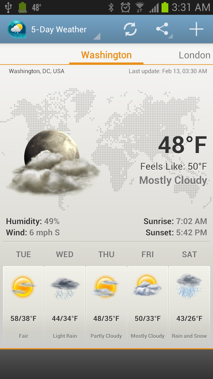 Weather & Clock Widget, the quick and accurate weather app, provides detailed weather for all cities worldwide, it searches your address and locates cities quickly, and provides the current temperature, current weather condition, humidity and wind speed and direction, in addition, five, ten days and hourly weather forecast. Weather & Clock Widget, is 100% free, and it comes with many cool widgets, portrait and landscape user interface. Weather & Clock Widget comes with different widget sizes, 2x1, 4x1, 4x2 and 4x3 for normal screens, and 5x1, 5x2 and 5x3 for large screens like Galaxy Note and tablets. Weather & Clock Widget supports a wide range of Android phones; it supports Android Version 2.2 and higher. Features: - Provides current weather condition and five days weather forecast - 10-Day and Hourly Weather - Sunrise and Sunset time - Temperature in status bar - Share weather and location information with friends. - Home screen widgets, 5x3, 5x2, 5x1 for large screen only and 4x3, 4x2, 4x1 and 2x1 for all screens. - Searches for all cities in the world by country and city or zip code - Ability to set your internet source to Wi-Fi only - Ability to disable internet access from operators while you are in roaming - Ability to set your preferred temperature unit, Celsius or Fahrenheit - Automatic update intervals are: 15 min, 30 min, 1, 3, 6, 9, 12 hours and Manual update. - Auto location detection - Up to 10 different locations - Weather map with ability to add any city to your city list - Notification alerts (with option disable it) - Localized to English, Dansk, Deutsch, Ελληνικά, Български, Suomi, Nederlands, Slovenčina, Slovenščina, Svenska, Română, كوردي ,العربية, Français, Hrvatski, Türkçe, Čeština, Español, Italiano, Português, Magyar, Pусский, Polski, Português(Brasil), Lietuvių kalba, Việt and 中文. FAQs: http://www.devexpert.net/androidweather/