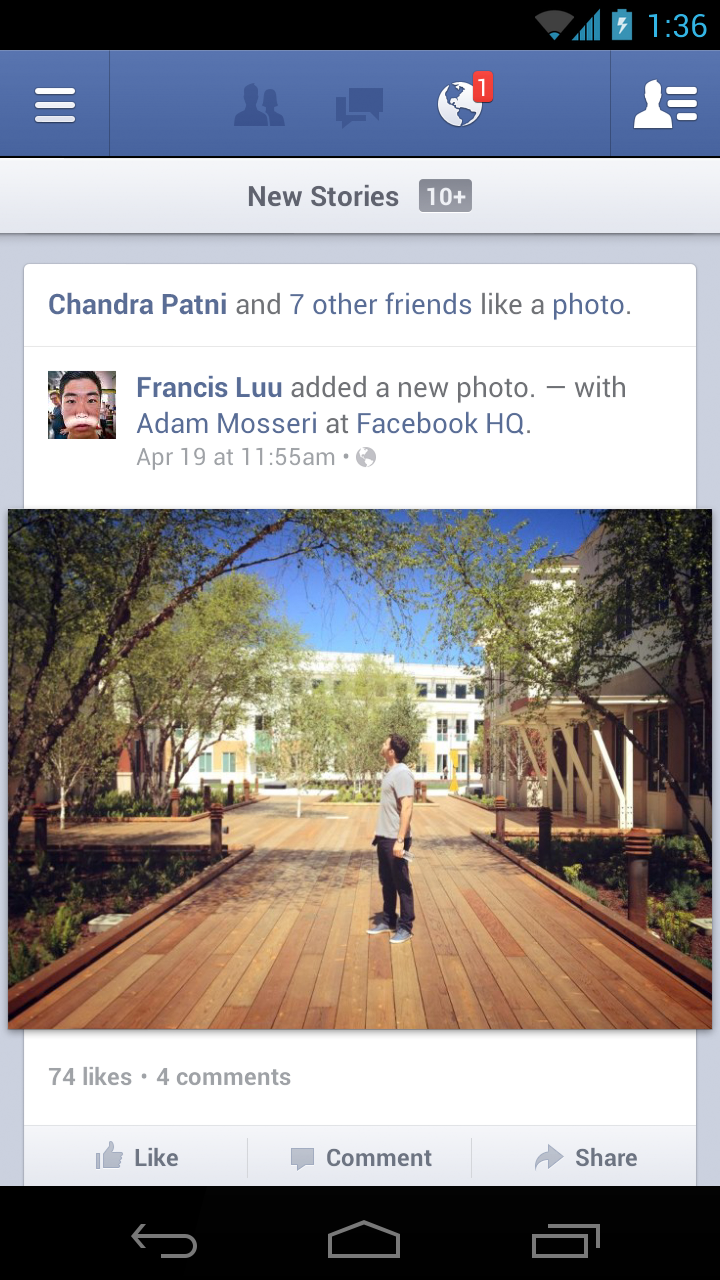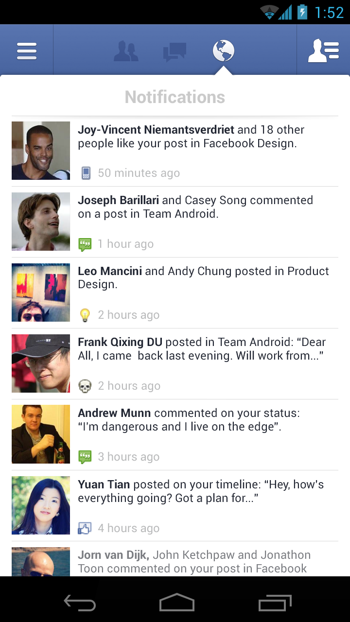 Keeping up with friends is faster than ever. • See what friends are up to. • Share updates, photos and videos. • Get notified when friends like and comment on your posts. • Text, chat and have group conversations. • Play games and use your favorite apps. Now you can get early access to the next version of Facebook for Android by becoming a beta tester. Learn how to sign up, give feedback and leave the program in our Help Center: http://on.fb.me/133NwuP. For an even better Facebook mobile experience, install Facebook Home: http://bit.ly/fbhomeapp. Currently available on certain devices, including the HTC One X series, Samsung Galaxy Note II and Samsung Galaxy S III. Facebook is only available for users age 13 and over. Terms of Service: http://m.facebook.com/terms.php.