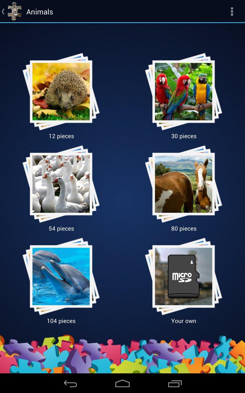 If you like jigsaw puzzles, you will love Jigzle. This app includes puzzles suitable for all ages, ranging from 12 to 104 pieces. So, whether you are looking for a small puzzle to share with your 3-year-old child or a more challenging one for your relaxing moments or waiting times, download Jigzle and start playing. In each of the apps in the Jigzle's series you will find 100 preloaded puzzles grouped by theme and, in addition, you will be able to create your own puzzles using your favourite photos. Put the pieces together as you would do in a real puzzle. Sort the pieces on the board and when you find two that seem to match, drag one near the other. If they really match, they will automatically join together. The difficulty of the puzzles can be increased by enabling the rotation of the pieces and largest puzzles can be recomposed organizing pieces in different areas of the board, zooming and scrolling the screen to move from one place to another. Additional features include: Ability to save an incomplete puzzle to resume it later. Puzzle image preview. Option to change the touch area size depending on your finger thickness.